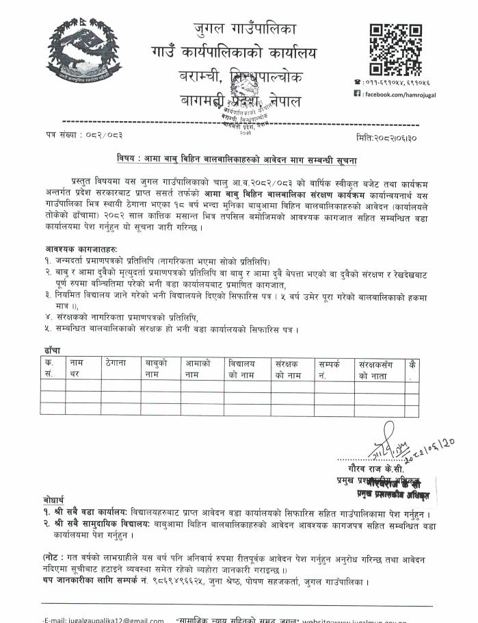 आमा बाबु बिहिन बालबालिकाहरुको आवेदन माग सम्बन्धी सूचना!