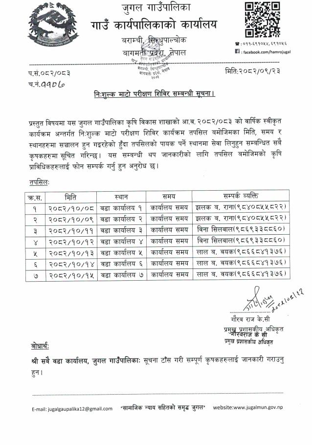 नि:शुल्क माटो परीक्षण शिविर संचालन सम्बन्धी सूचना!