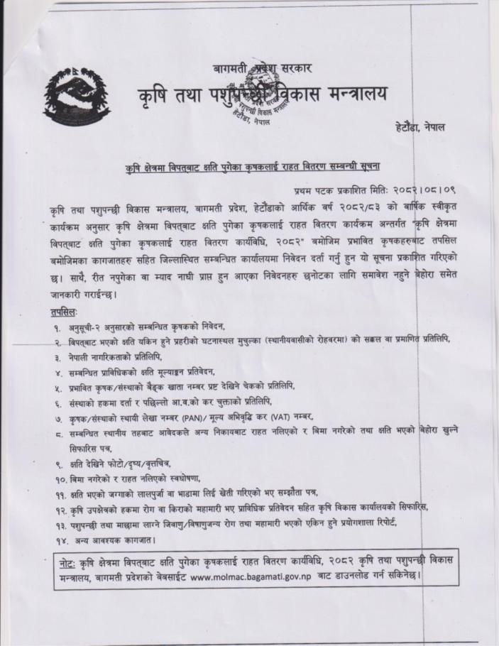कृषि क्षेत्रमा विपतबाट क्षति पुगेका कृषकहरुलाई राहत वितरण सम्बन्धी कृषि तथा पशुपन्छी विकास मन्त्रालय हेटौँडाको सूचना!