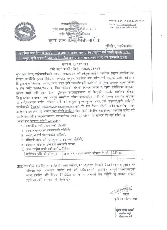 कृषि ज्ञान केन्द्र काभ्रेपलाञ्चोकको प्राङगारिक मल वितरण कार्यक्रम अन्तर्गत प्राङ्गारिक मल प्रयाेग/ खरिद गर्न चाहने कृषक, कृषक समूह, कृषि सहकारी तथा कृषि फर्महरुलाई प्रस्ताव आह्वानको म्याद थप सम्बन्धी सूचना !