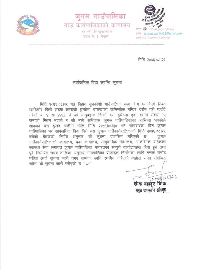 जुगल गाउँपालिका भर ( मिति २०७६।०८।३० गते ) सार्वजनिक बिदा हुने संबन्धि सूचना