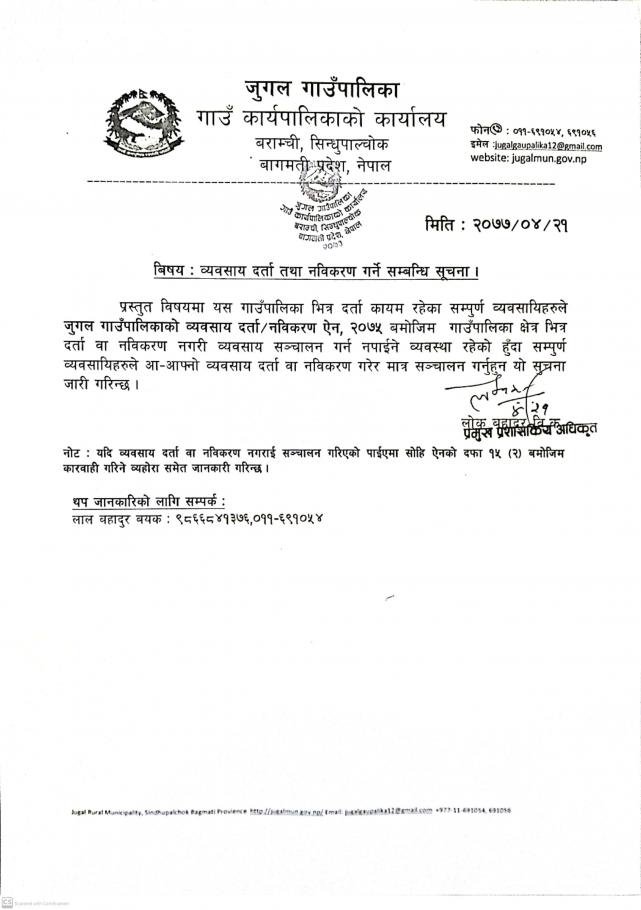 ब्यबसाय दर्ता तथा नवीकरण गर्ने सम्बन्धि सूचना ।