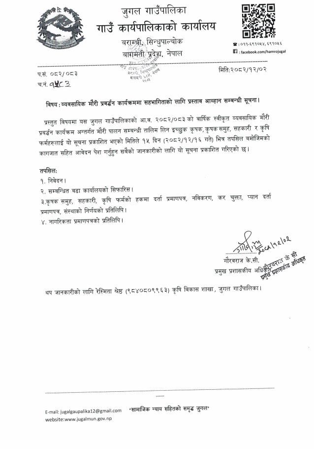 व्यवसायिक मौरी प्रवर्द्धन कार्यक्रममा सहभागिताको लागि प्रस्ताव आव्हान सम्बन्धी सूचना!