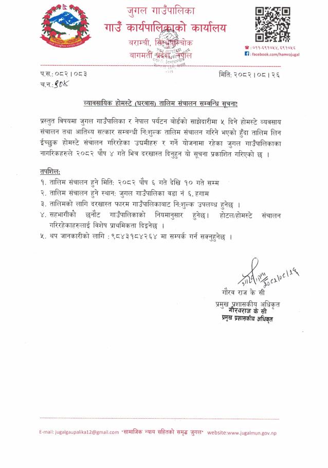 व्यावसायिक होमस्टे (घरबास) तालिम संचालन सम्बन्धि सूचना!