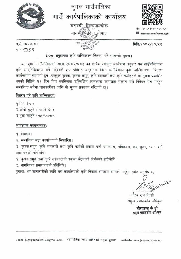 ५०% अनुदानमा कृषि यान्‍त्रिकरण वितरण गर्ने सम्बन्धी सूचना!